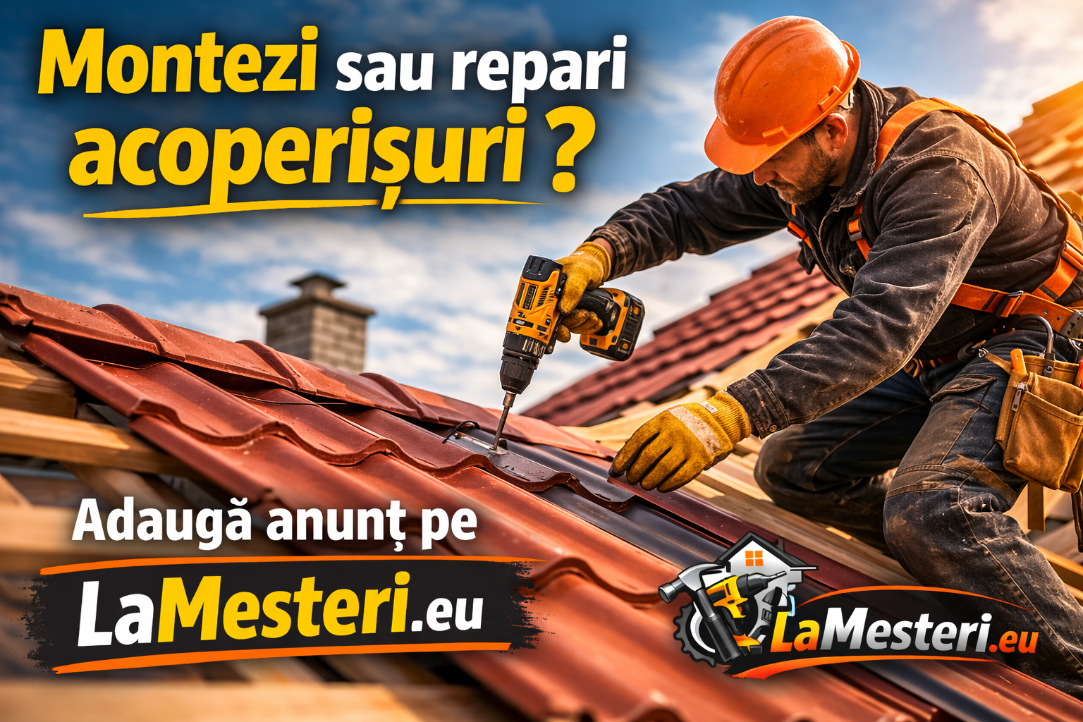 Meșterii înscriși pe LaMesteri.eu oferă servicii complete pentru acoperișuri: proiectare și consultanță, montaj acoperiș nou, înlocuire totală sau parțială, reparații locale, hidroizolații, termoizolații, montaj jgheaburi și burlane, precum și amenajarea și izolarea mansardelor. Fiecare meșter își prezintă clar specializările în profil, astfel încât să puteți alege rapid echipa potrivită pentru tipul de acoperiș și bugetul dumneavoastră.