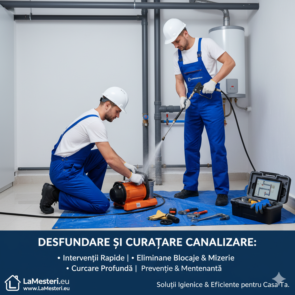 Pe LaMesteri.eu, găsești instalatori sanitari și firme specializate care intervin cu utilaje profesionale pentru a desfunda și curăța eficient rețeaua ta de canalizare.