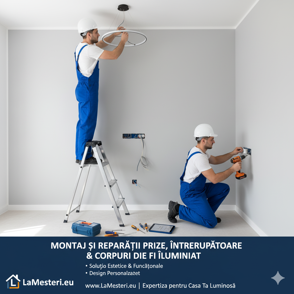 Pe LaMesteri.eu, găsești firme specializate și electricieni autorizați ANRE care oferă servicii complete de montaj, reparații și modernizare pentru prize, întrerupătoare și corpuri de iluminat, folosind echipamente certificate și tehnologie de ultimă generație.