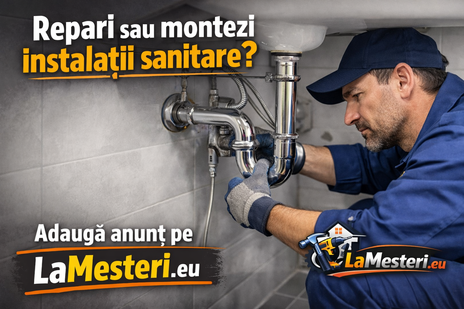 Pe LaMesteri.eu găsești rapid instalatori profesioniști pentru orice tip de lucrare de instalații sanitare. Fie că ai nevoie de montaj obiecte sanitare (chiuvete, lavoare, WC, bideuri, cabine de duș, căzi), înlocuire robineți și baterii, reparații instalații de apă și canalizare, sau montaj și întreținere țevi PPR, cupru și PVC, echipa noastră de meșteri este gata să te ajute.