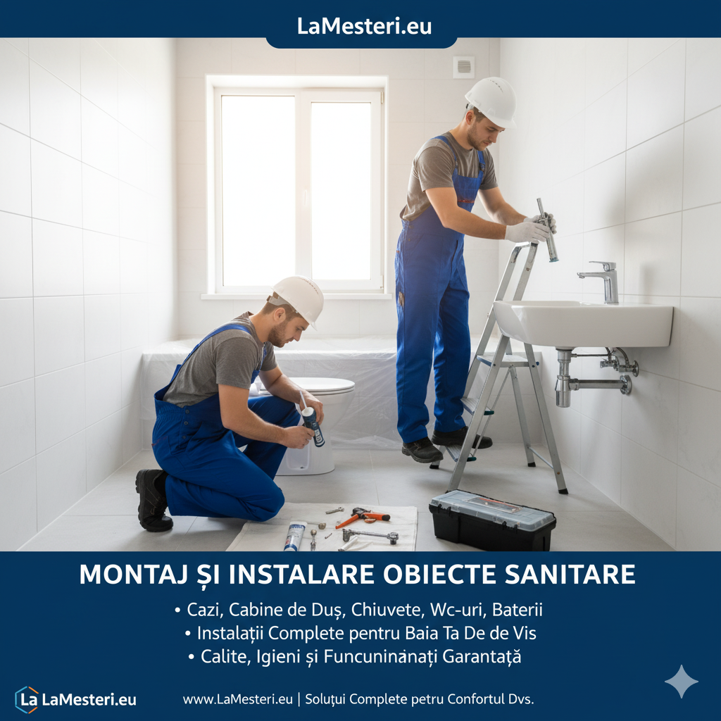 Pe LaMesteri.eu, poți găsi rapid firme și meșteri specializați în montajul obiectelor sanitare — de la lavoare și vase WC, până la cabine de duș, căzi și bideuri, pentru orice tip de proiect rezidențial sau comercial.
