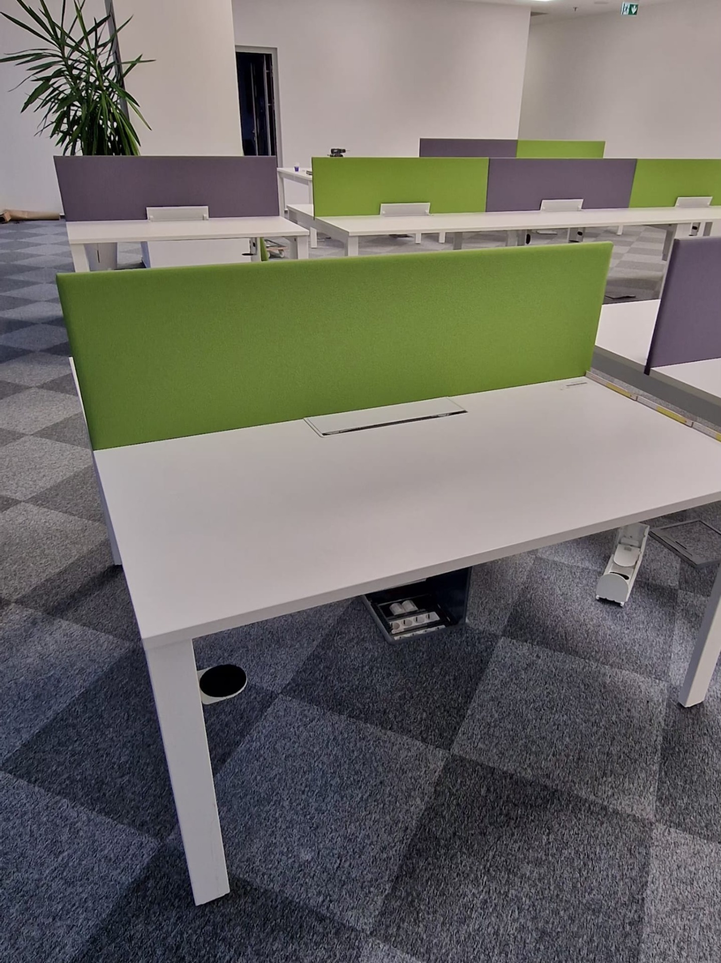 Capac Suport Cabluri (Grommet): Fiecare spațiu de lucru este prevăzut cu un capac suport cabluri (grommet) integrat în blat, permițând trecerea ordonată a cablurilor de la monitor/laptop direct sub birou, în canalul de cabluri.