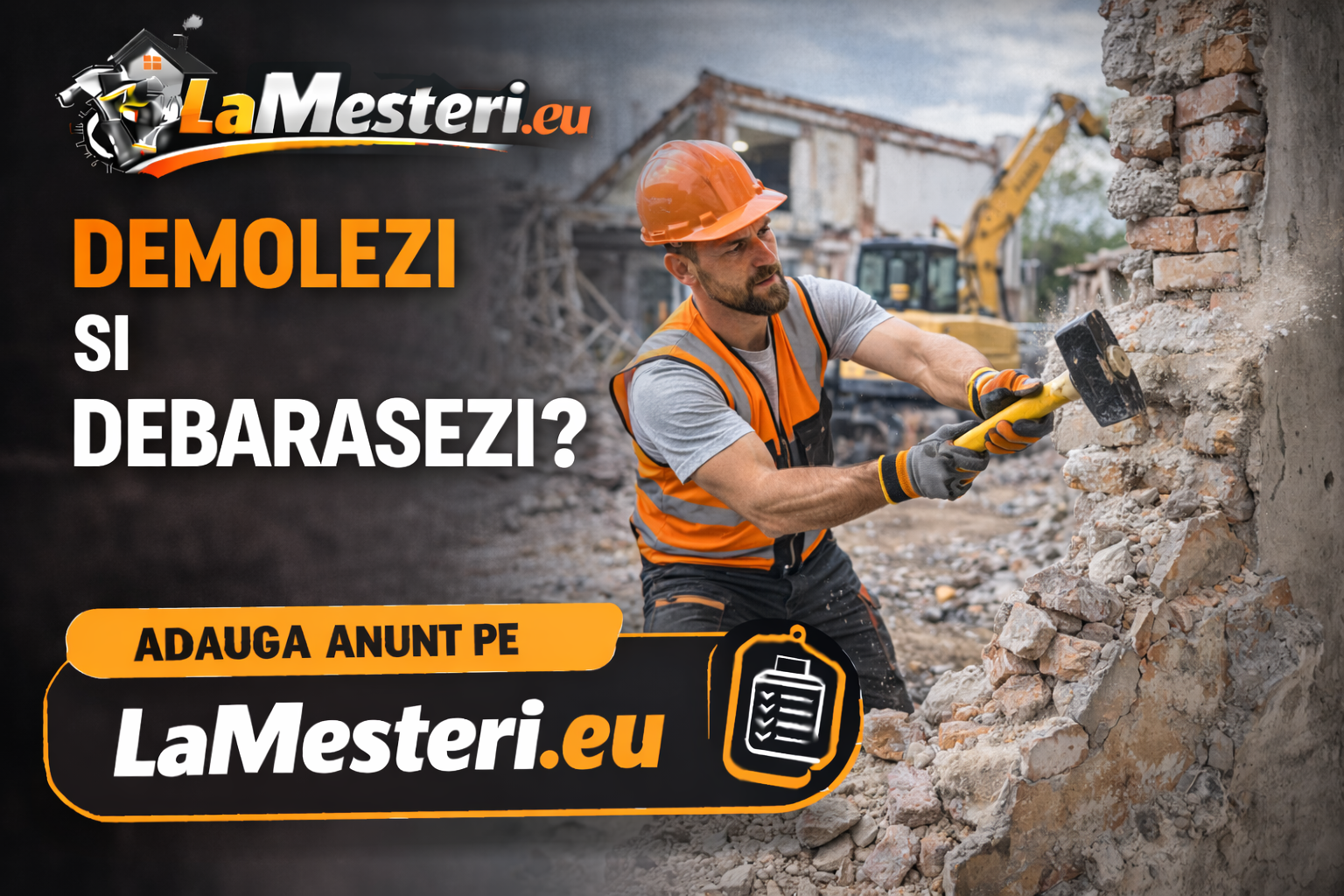 Pe LaMesteri.eu poți găsi rapid echipe autorizate pentru lucrări de demolare, decopertare și debarasare, disponibile pentru proiecte mici sau mari, rezidențiale ori industriale.